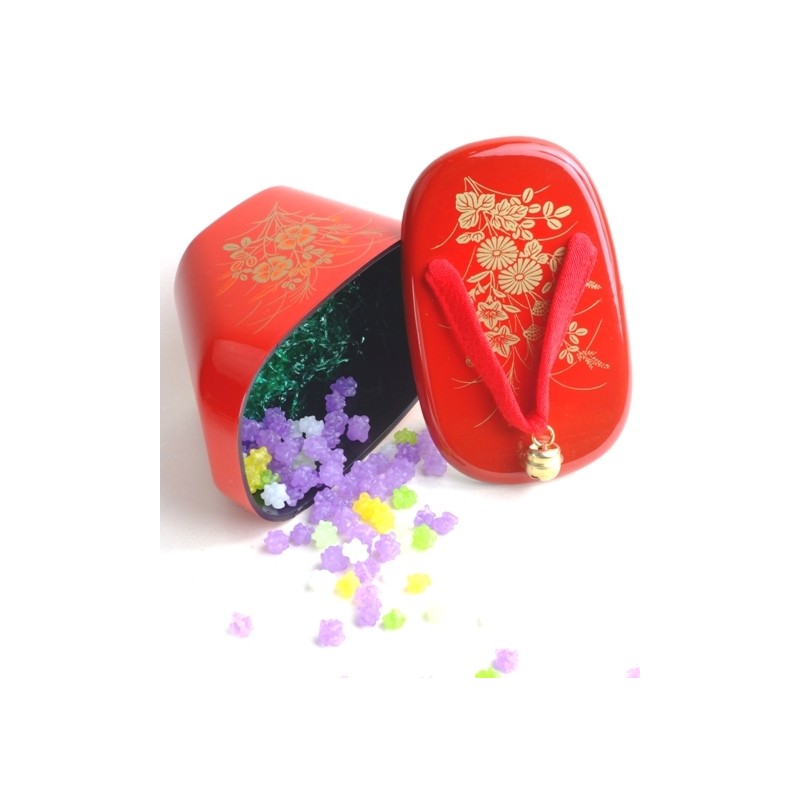 做成木屐形狀經過塗漆,充滿高級感的盒子中有金平糖與軟心豆粒糖。