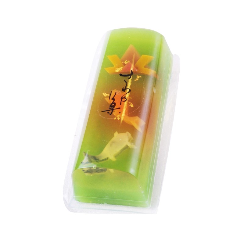 由於羊羹是製作成2層像漸層一般重疊在一起,因此從側面看就會發現日本兒童節的可愛花樣像是漂浮在綠色的羊羹中,十分活潑生動。