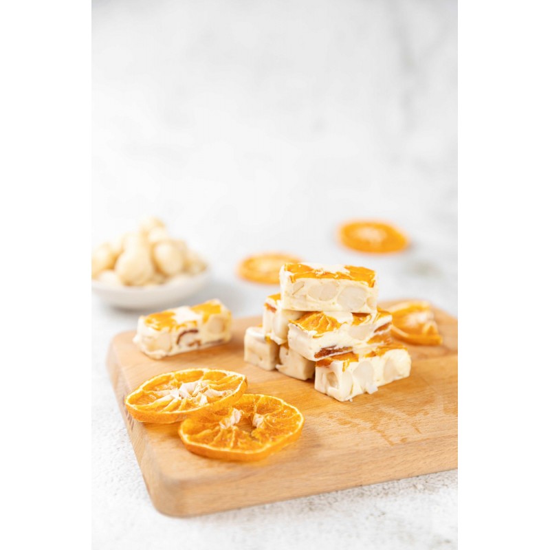 [原料] 麥芽糖、夏威夷果、柑橘果乾、全脂奶粉、海鹽、法國無鹽發酵奶油、日本極樂糖(蔗糖、食鹽)、蛋白霜、柑橘果泥、柑橘果醬、新鮮柳橙皮、日本特濃柑橘片、柳橙果泥、糯米紙