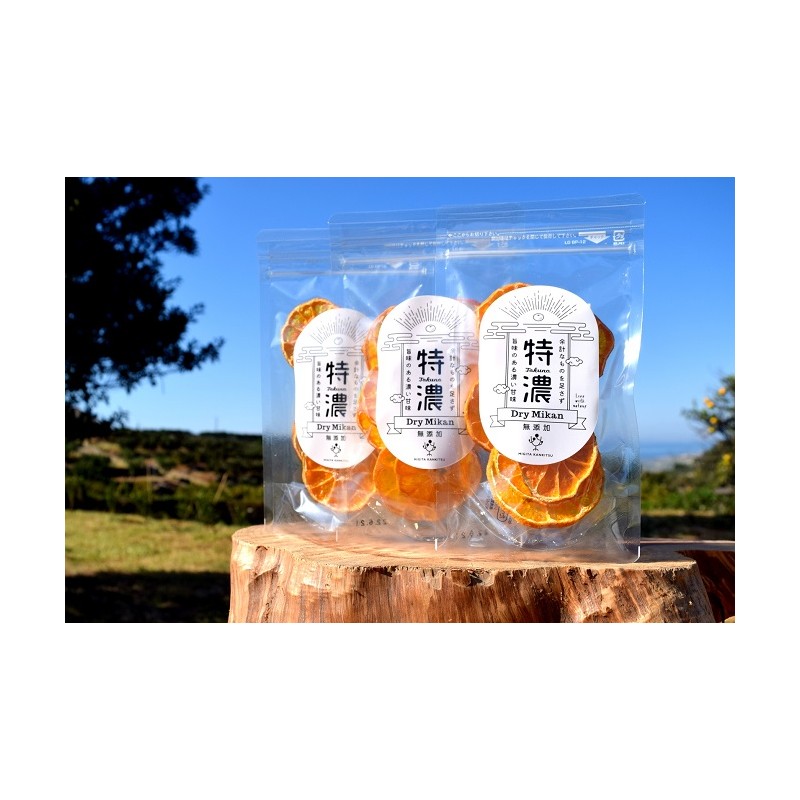 由精心挑選自家種植的熟成柑橘,切片製成的柑橘乾。正如商品名稱所標示“特濃”, 選用味道濃郁的柑橘作為原料,為保留柑橘果肉的質地及天然果皮的微苦,切成略厚的薄片,以低溫乾燥精心製作而成,所以此款柑橘乾的甜味與口感都非常濃郁。