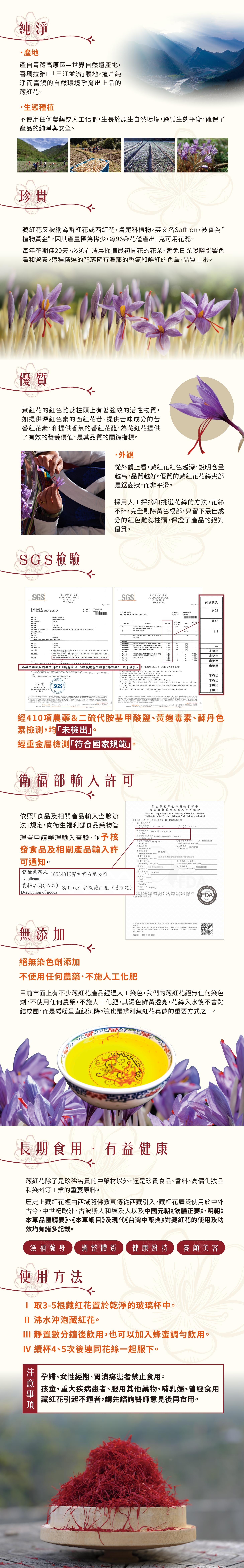 歷史上藏紅花經由西域隨佛教東傳從西藏引入,藏紅花廣泛使用於中外古今,中世紀歐洲、古波斯人和埃及人以及中國元朝《飲膳正要》、明朝《本草品匯精要》、《本草綱目》及現代《台灣中藥典》對藏紅花的使用及功效均有諸多記載。