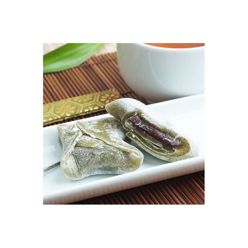 將揉入艾葉的麻糬皮包入紅豆餡製作而成的和菓子甜品。